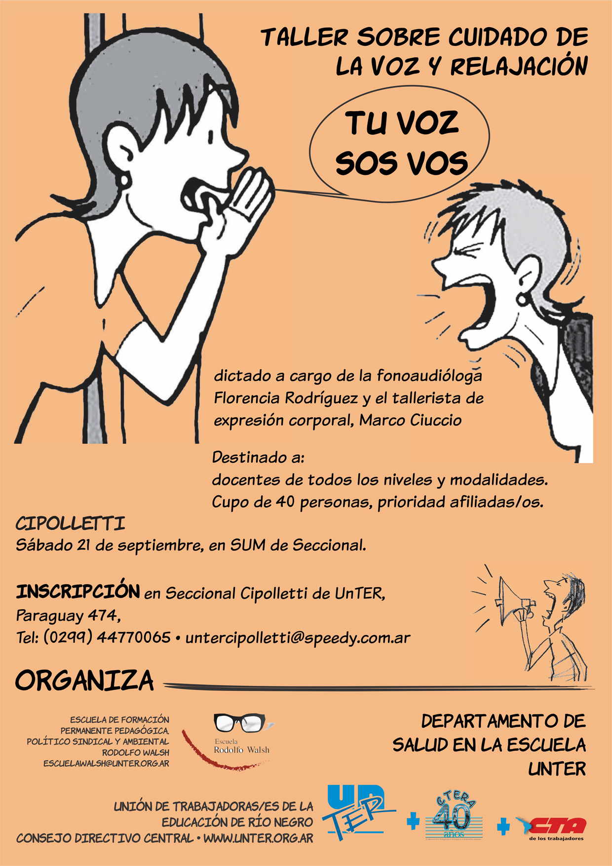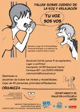 El viernes 23 de agosto, se realizó el taller sobre el cuidado de la voz y relajación en Cinco Saltos, 50 docentes de todos los niveles y modalidades participaron de la jornada de formación que estuvo a cargo de la fonoaudióloga, Florencia Rodríguez y el tallerista de expresión corporal, Marco Ciuccio. La actividad fue organizada por la Escuela de formación permanente pedagógica, político – sindical y ambiental "Rodolfo Walsh" de Unter.