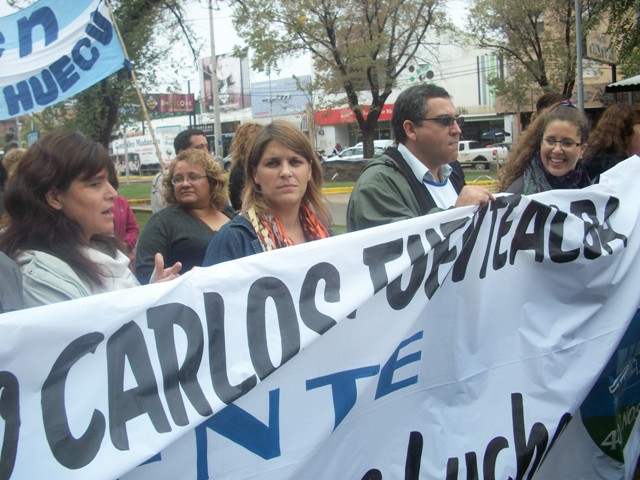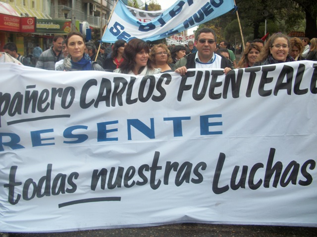 Sandra Rodríguez ,la compañera del maestro se refirió a la causa Fuentealba II, donde se investigan las responsabilidades políticas en el asesinato. "Los quiero convocar cada 4 de abril para pedir justicia por Carlos Fuentealba. Necesitamos levantarnos para recuperar nuestra dignidad. Necesitamos la reparación de la justicia. El ex gobernador Jorge Sobisch fue el que dio la orden, fue el responsable del operativo donde quisieron matar un trabajador, a un padre, a un compañero. Cualquiera de ustedes podría haber sido Carlos. Que no haya mezquindades. Arriba las banderas de la justicia", concluyó Rodriguez.
