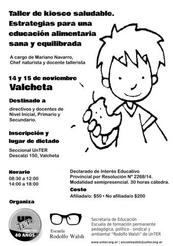 Valcheta, 14 y 15 de noviembre. Jornada de formación a cargo de Mariano Navarro, Chef naturista y docente tallerista. Destinado a directivos y docentes de Nivel Inicial, Primario y Secundario. Declarado de interés por Resolución N° 2268/14