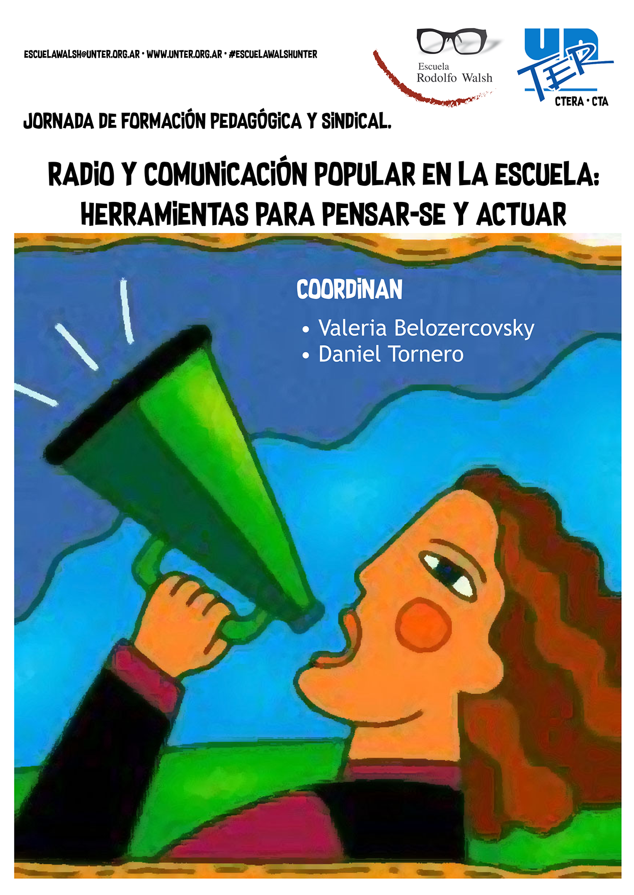 Valcheta, 9 y 10 de noviembre. Jornada de formación destinada a docentes de todos los niveles y modalidades afiliadas y afiliados a UnTER. A cargo de Valeria Belozercovsky y Daniel Tornero. Declarada de Interés Educativo por Resolución Nº 2862/18. Modalidad semipresencial. Duración 20 horas cátedra.