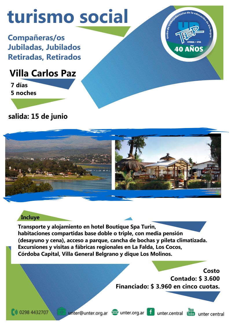 El Consejo Directivo Central de UnTER realizó un convenio con la empresa “London Travel” para realizar tres viajes grupales durante el 2015. La propuesta, esta destinada a compañeras/os jubiladas/os y retiradas/os. La primer salida será el 15 de junio, con destino a Villa Carlos Paz.