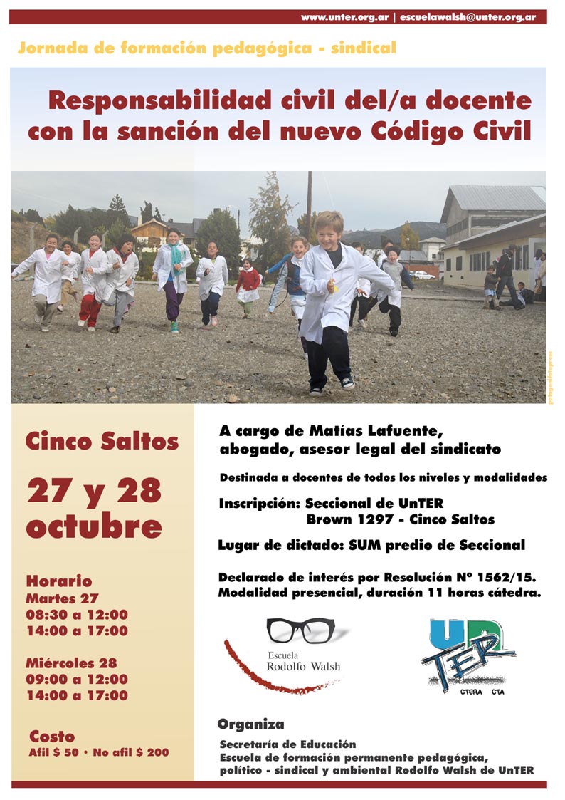 Cinco Saltos, 27 y 28 de octubre. Jornada de formación destinada a docentes de todos los niveles y modalidades. A cargo de Matías Lafuente, abogado, asesor legal del sindicato. Declarado de interés por Resolución Nº 1562/15. Modalidad presencial, duración total 11 horas cátedra.