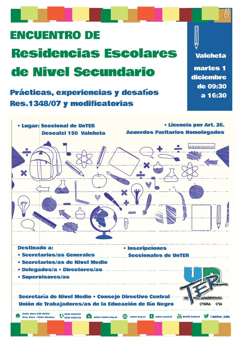 La jornada, organizada por la Secretaría de Nivel Medio del Consejo Directivo Central de UnTER, esta destinada a Secretarios/as Generales, Secretarios/as de Nivel Medio, Delegados/a, Directores/as, Supervisores/as. La inscripción es en Seccionales de UnTER y la licencia se enmarca en el Art. 26. de la Resolución Nº 146/94 de Acuerdos Paritarios Homologados.
