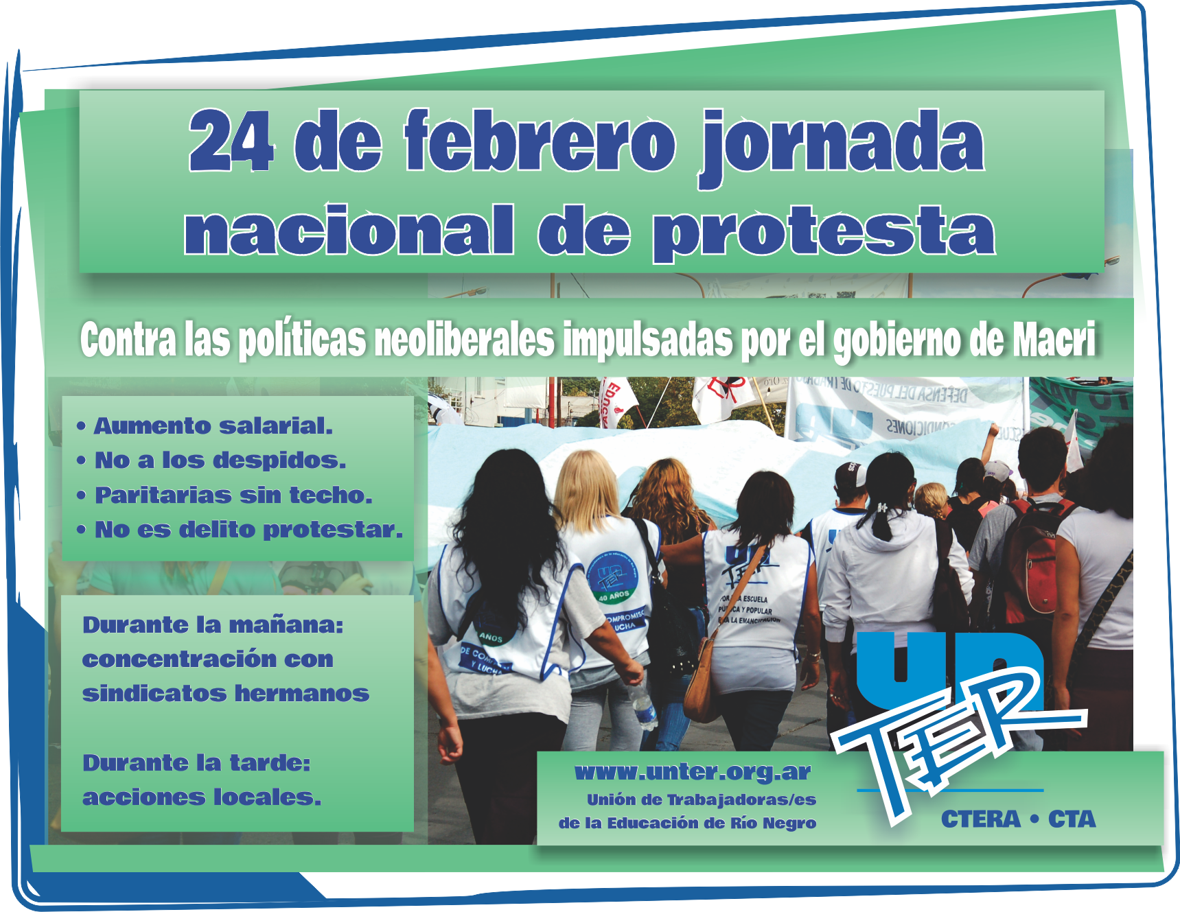 El Plenario de Secretarias y Secretarias Generales de UnTER, realizado el 17 de febrero en Roca – Fiske Menuco resolvió acompañar la Jornada Nacional de protesta del 24 de febrero, convocada por organizaciones sindicales de todo el país, para reclamar contra las políticas neoliberales impulsadas por el gobierno de Macri: no a los despidos, por paritarias libres y contra la criminalización de la protesta.