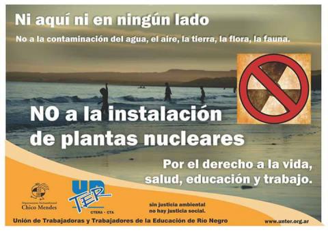 El Consejo Directivo Central de UnTER expresa su absoluto repudio frente a cualquier intento de imponer una planta nuclear en Río Negro. Acompañamos las acciones de rechazo iniciadas por docentes de Sierra Grande junto a organizaciones sociales, frente a la posibilidad de que se pueda instalar en esa localidad y lo haremos en cada lugar donde sea necesario decir No a la contaminación y el saqueo.
