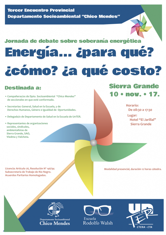 En Sierra Grande, el 10 de noviembrese realizará la “Jornada de debate sobre soberanía energética. Energía… ¿para qué? ¿cómo? ¿a qué costo?”, enmarcada en el tercer encuentro provincial de Departamento Socioambiental “Chico Mendes” de la UnTER. Silvana Bujan de BIOS - Red Nacional de Acción Ecologista, RENACE, grabó una conferencia en vídeo para la ocasión. Participarán como panelistas: Martin Alvarez Mullally y Fernando Cabrera Christiansen del Observatorio Petrolero Sur, OPSur y Jorge Chemes del Taller ecologista – Observatorio de Energía y Sustentabilidad, Universidad Tecnológica Nacional.