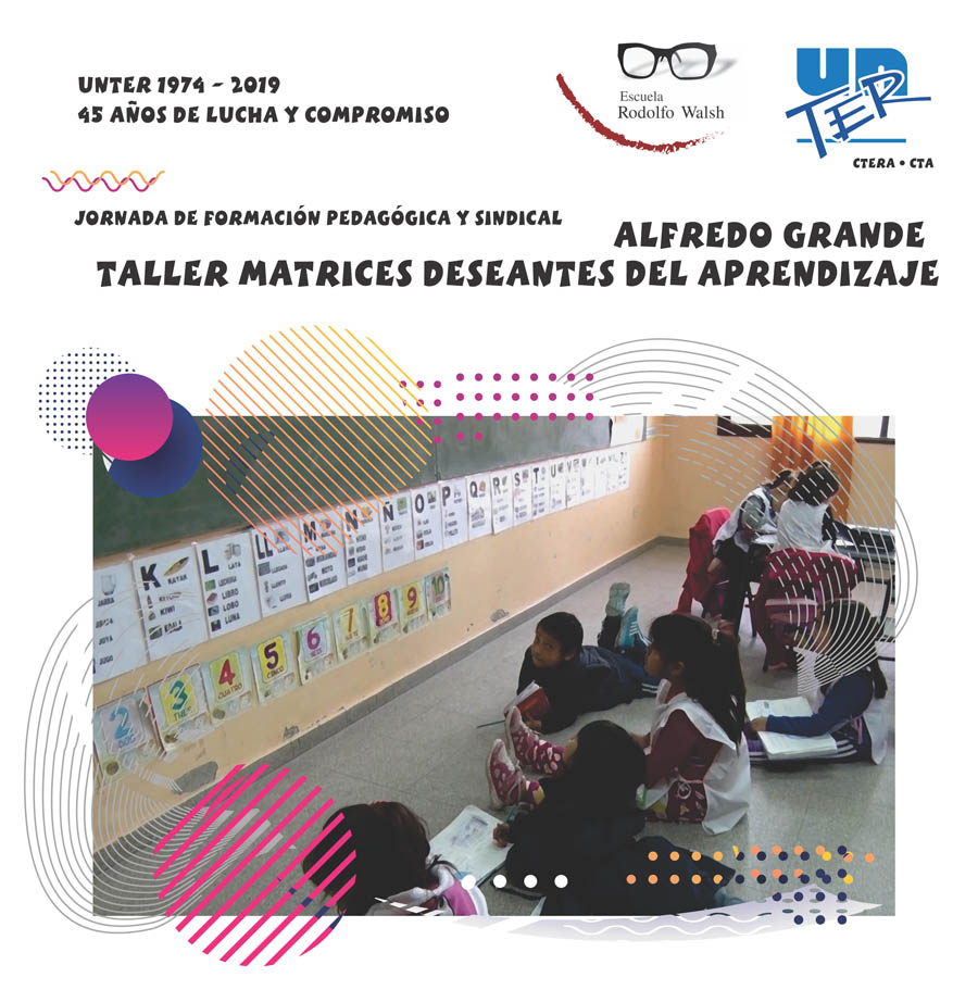Bariloche, 27 y 28 de agosto de 2019. Jornada de formación pedagógica – sindical “Taller Matrices Deseantes del Aprendizaje”, dictada por Dr. Alfredo Grande, destinada de docentes de todos los Niveles y modalidades afiliados/as a Unter. Declarada de Interés Educativo Provincial por Resolución 3347/19 CPE RN. Duración 30 horas cátedra. Modalidad semipresencial.