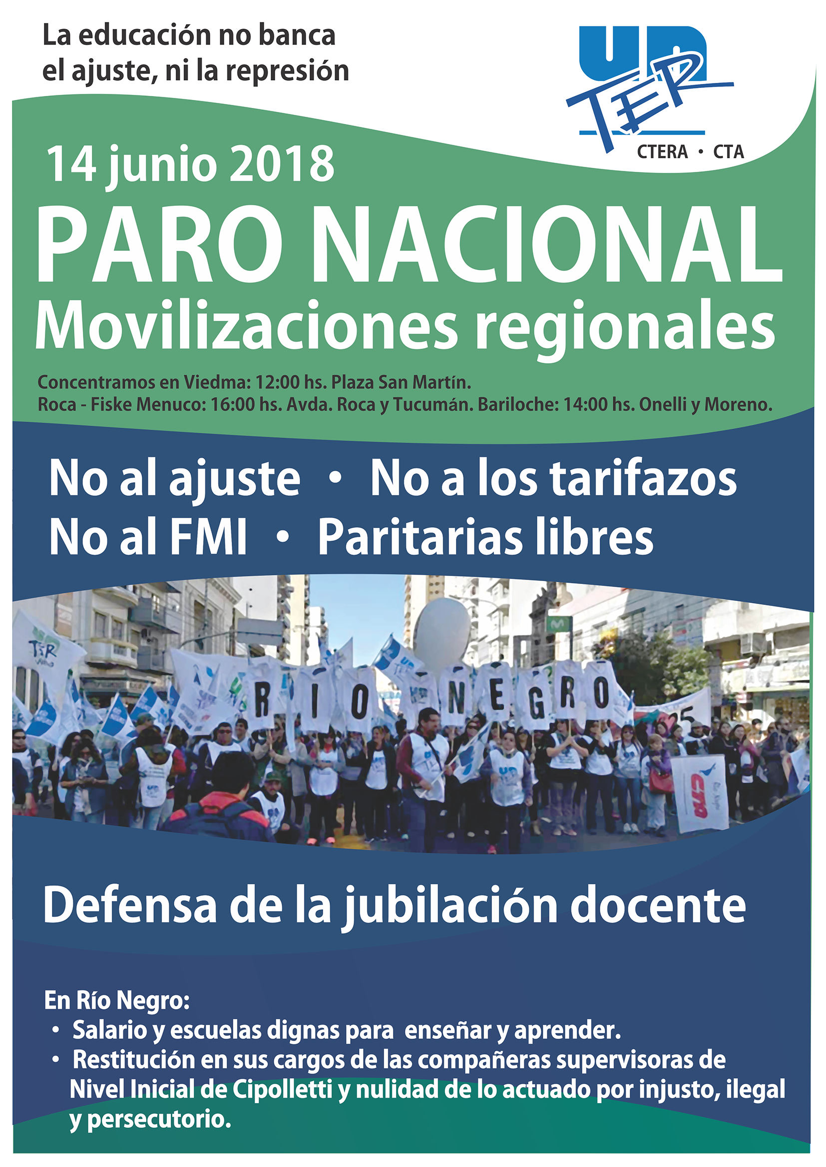 14 de junio de 2018. Paro Nacional. Movilizaciones regionales. Concentramos en Viedma: 12:00 hs. Plaza San Martín • Roca - Fiske Menuco: 16:00 hs. Avda. Roca y Tucumán. • Bariloche: 14:00 hs. Onelli y Moreno.