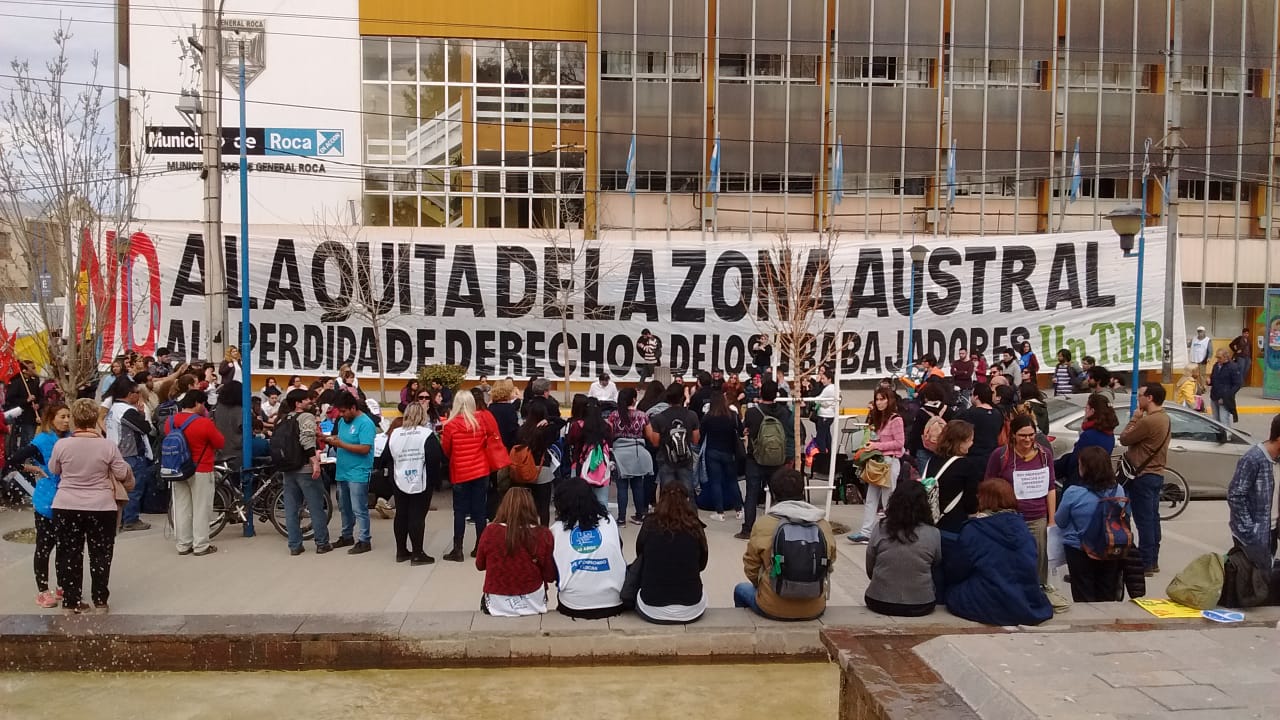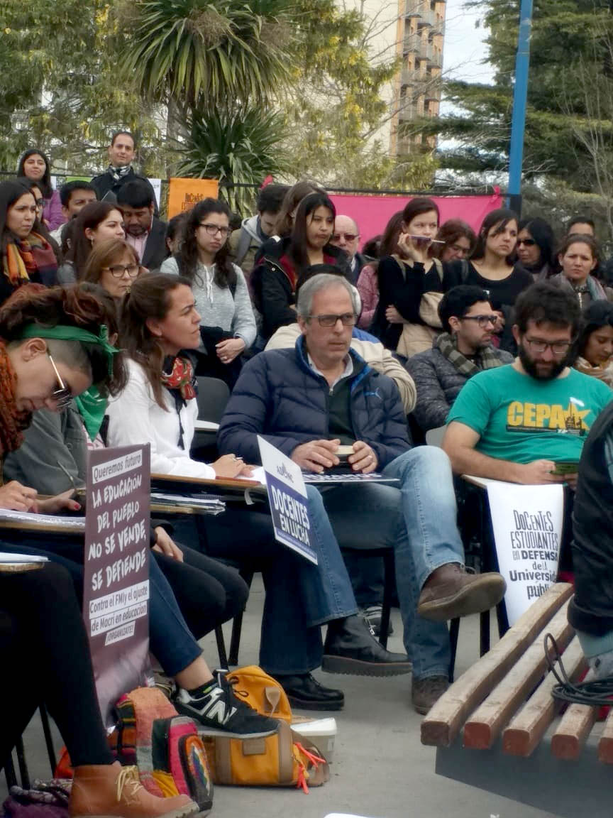 En la plaza Belgrano de Roca – Fiske Menuco, junto a docentes y estudiantes de las Facultades de Lengua y de Derecho y Ciencias Sociales de la Universidad Nacional del Comahue. Sesión pública para exponer la crisis presupuestaria.