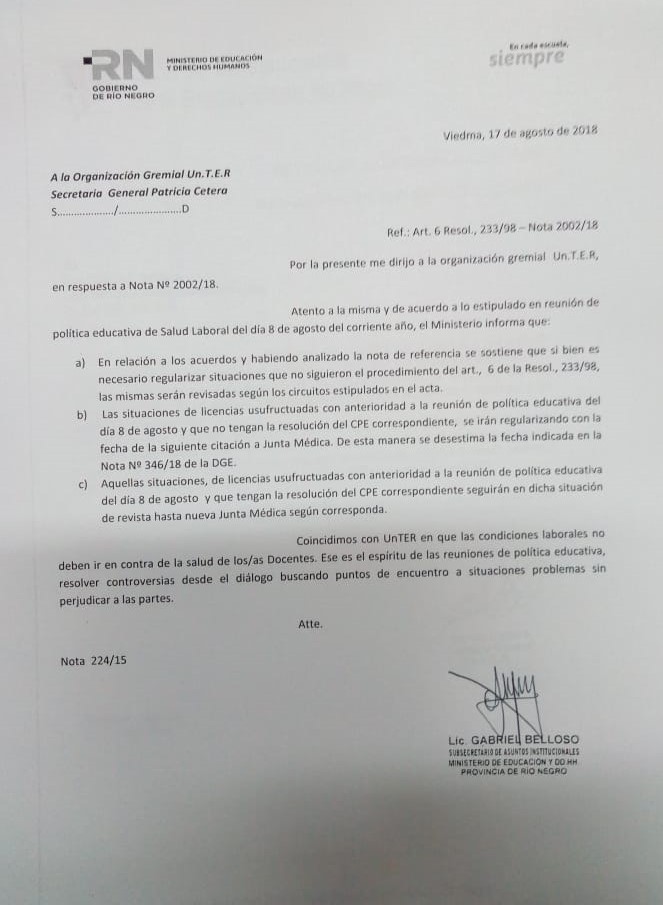 El 16 de agosto, en Viedma, UnTER presentó al Ministerio de Educación y Derechos Humanos, sendos reclamos administrativos exigiendo la plena vigencia de la Resolución 233/98, Acuerdos Paritarios Homologados respecto de la aplicación del Art. 6, readecuación de tareas y aplicación de Art. 20 y 25, razones particulares y asistencia a cursos de formación, respectivamente. Ambos reclamos ya fueron presentados en las reuniones de política educativa, salud en la escuela y en Paritarias, frente al intento de recortar derechos por interpretaciones arbitrarias de funcionarixs del CPE.
