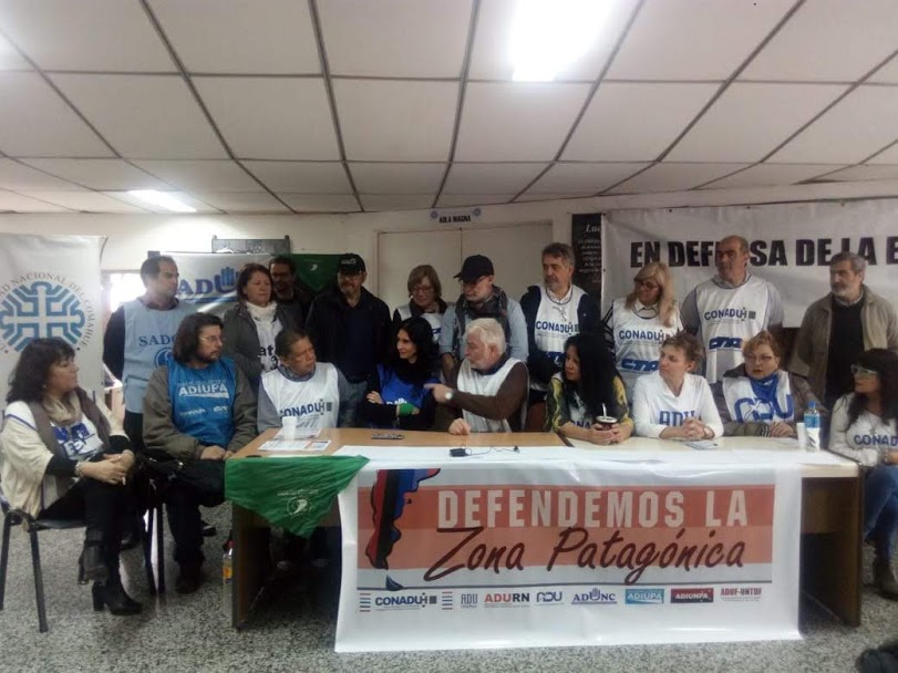 El viernes 28 de septiembre, en Neuquén se realizó el Encuentro Sindical Patagónico de la Docencia Universitaria y pre-universitaria en defensa de la Zona Patagónica, organizado por la CoNaDU Histórica, con la participación de los sindicatos docentes universitarios de la Región Patagónica ADUNC, ADUF, ADIUNPA, ADU PSJB, ADURN, ADIUPA y como invitados Aten y UnTER.