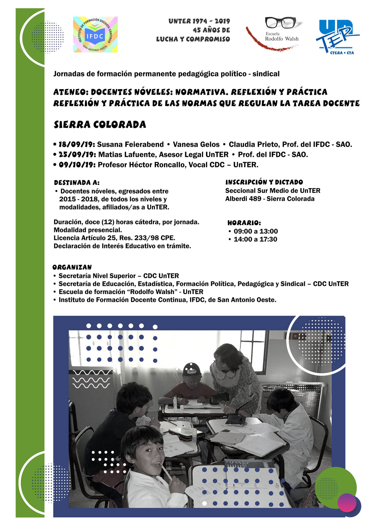 18, 25/09 y 9/10/19 Sierra Colorada, “Reflexión y práctica de las normas que regulan la tarea docente” Jornada de formación permanente pedagógica político – sindical, destinada a docentes nóveles, egresados entre 2015-2018, de todos los niveles y modalidades, afiliados/as a UnTER.