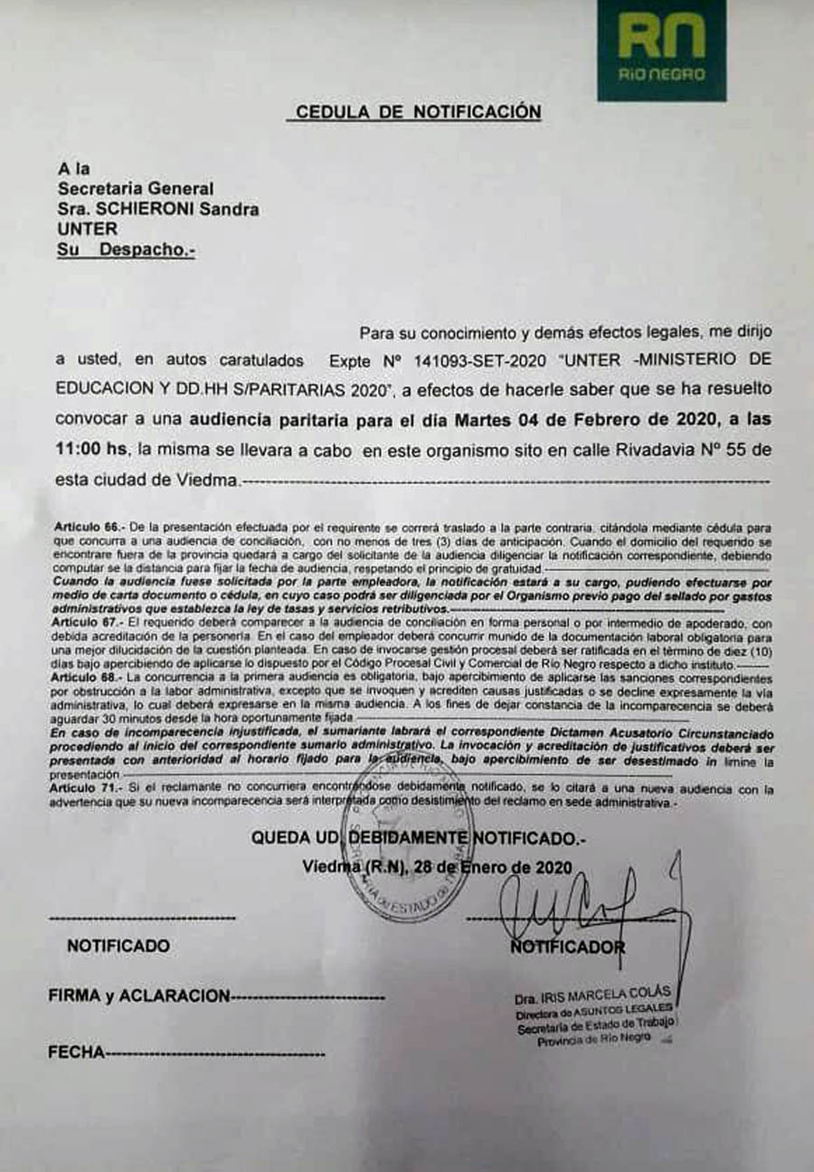Pasado el medio día del 28 de enero, se recibió la convocatoria formal a reunión paritaria para el 4 de febrero, a las 11:00 horas en la Secretaría de Trabajo en Viedma. Reiteramos la necesidad de discutir salario de manera trimestral, con revisión mensual, sostenemos que todo aumento debe superar el índice inflacionario para que ningún/a docente quede por debajo de la línea de pobreza con sumas remunerativas y bonificables.