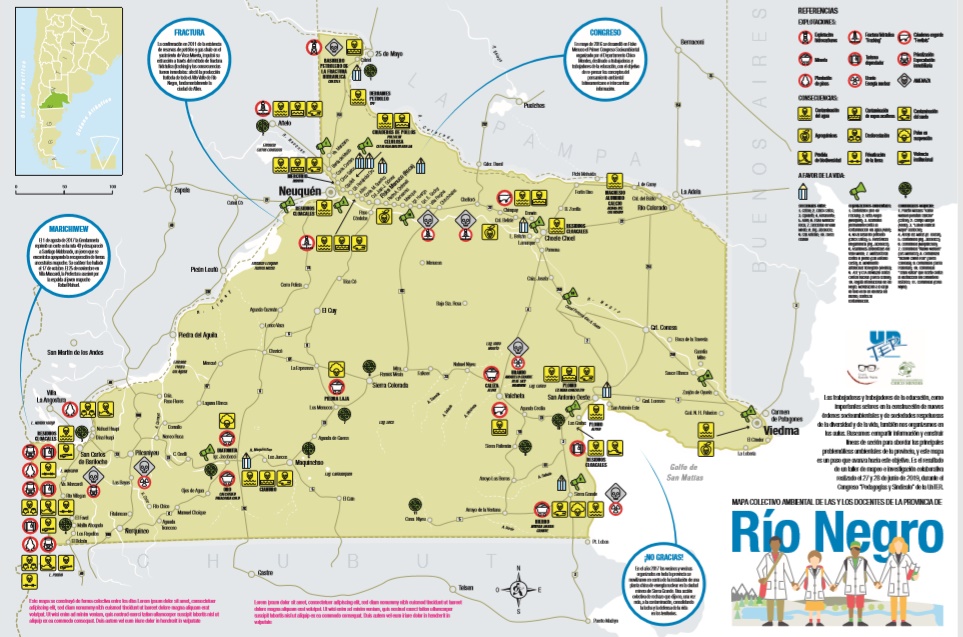 Las trabajadoras y trabajadores de la educación, como importantes actores en la construcción de nuevos órdenes socioambientales y de sociedades respetuosas de la diversidad y de la vida, también nos organizamos en las aulas. Buscamos compartir información y construir líneas de acción para abordar las principales problemáticas ambientales de la provincia, y este mapa es un paso que avanza hacia este objetivo. Es el resultado de un taller de mapeo e investigación colaborativa realizado el 27 y 28 de junio de 2019, durante el Congreso “Pedagogías y Sindicato” de la UnTER.