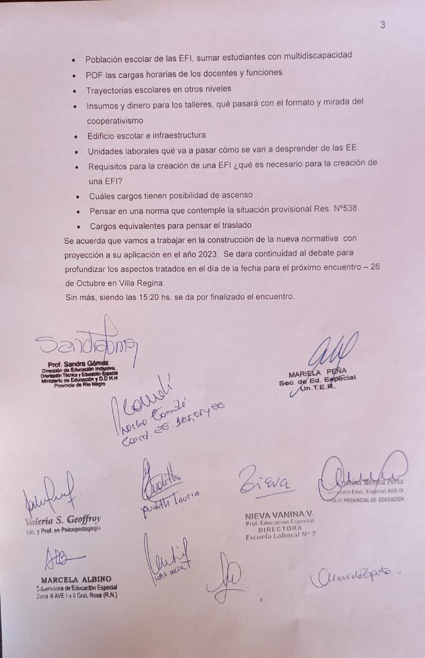 Con la representación de compañeras del CDC y de la Comisión gremial, se mantuvo la reunión en la ciudad de Viedma, en la cual se conversó sobre la propuesta de la DEI sobre las EFI (Escuelas de formación integral) y se plantearon ejes de análisis y debate que surgieron desde los encuentros sindicales realizados los días 14, 15 y 17 de septiembre.